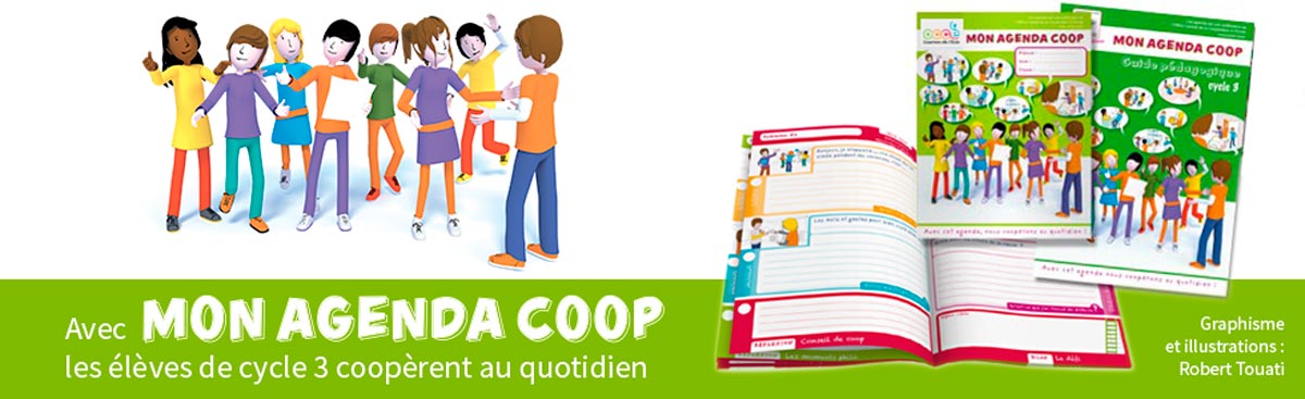 L'agenda coop est un outil pédagogique illustré dans lequel, chaque jour, les enfants découvrent une question et une activité pour apprendre à se connaître et s'estimer, aller vers les autres et mieux les respecter. L'agenda coop, c'est :